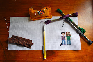 After looking at the pattern, I made a grid in Paint (graph paper and pencil would have been easier, but harder to find in my house) and started "sketching." None of the three of us are petite, so I added width and height to my people - and should have enlarged the cat similarly!