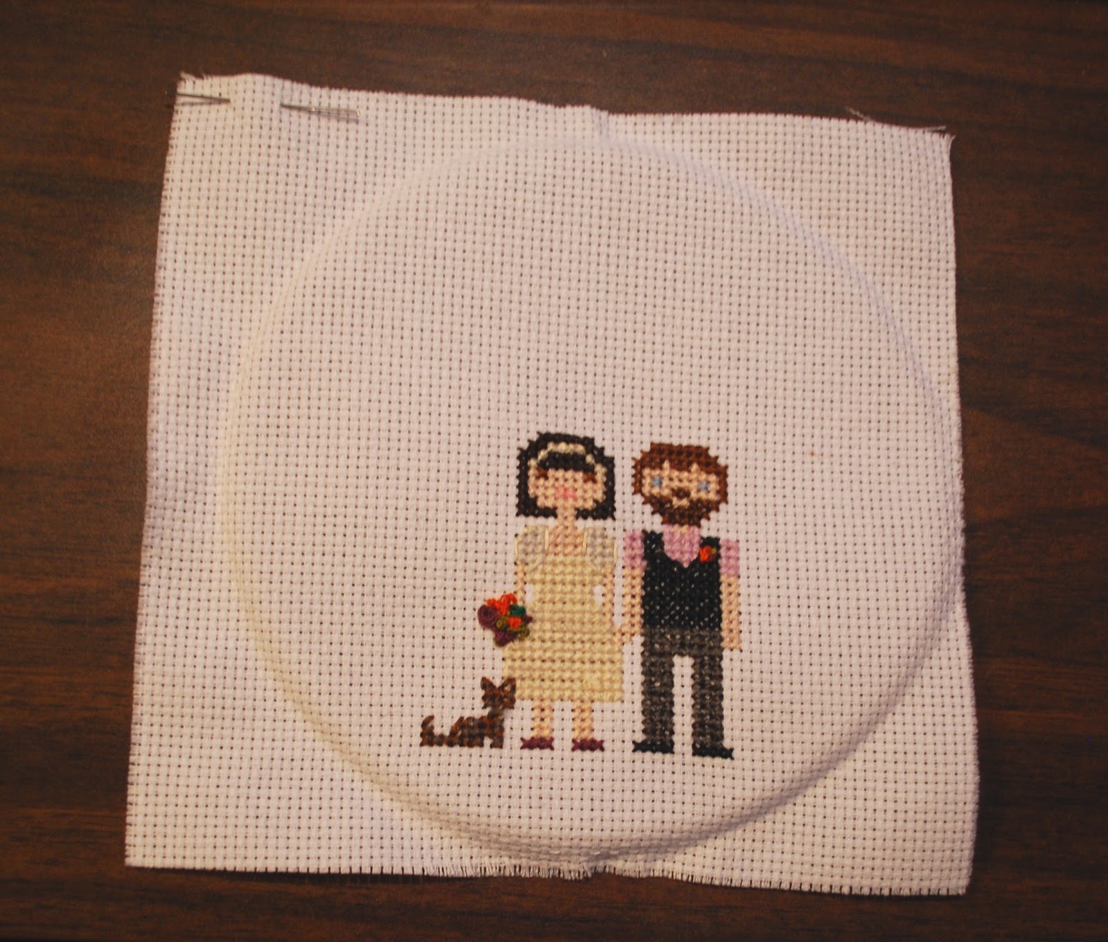 I don't love it as much. I wish I hadn't attempted the bouquet, but I am not cutting it out now. I had planned to do a half stitch background (grass and sky) to keep the dress from blending into the white background too much. I'm holding off on that decision until I have a better idea where these will hang and the lighting they'll be under. I prefer the simplicity and coordination of both having the white background, but I don't want to lose the dress either.