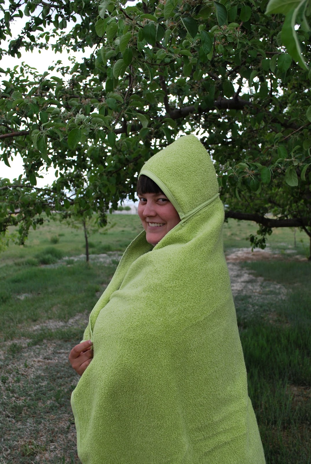 Alright, so it's a little small for me, but with no convenient access to any one under the age of twenty four, I did the best I could. I am tempted to try for an adult version, maybe with a bath sheet. It could be handy for walking home from the hot tub at night. Hmm...