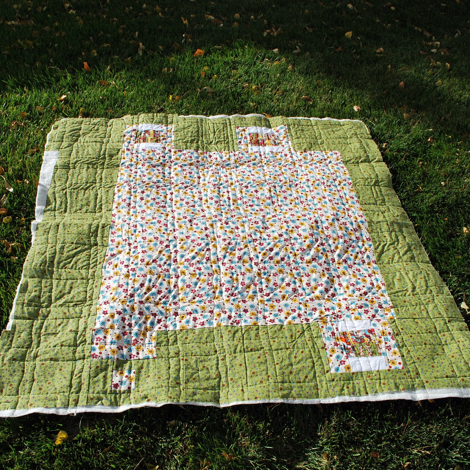 This is my first eye-spy/patchwork attempt. It's also for a family who spends a lot of time hiking/camping, and who won't be finding out the gender of their newest addition until the birth. So, the plan was to try a new-to-me style and to go with outdoorsy but not gender specific colors/prints.