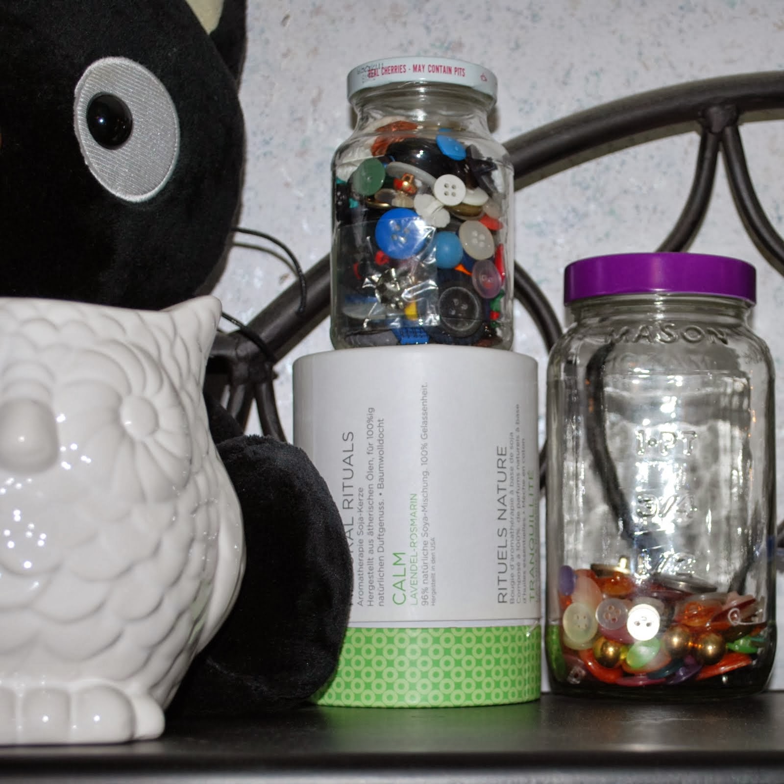 I also sorted out my latest button haul from a full shoe box into the larger, but emptier, glass jar on the top shelf. It's not completely functional - but again, a big improvement over what I had going on yesterday. When I'm short on inspiration, I love twisting the jars like an eye-spy game, searching the buttons or colors for some ideas or inspiration. That was one of my favorite things to do when I used to sit in my mother's sewing room, so whether there's a more organized way of keeping buttons or not, the jars stay.