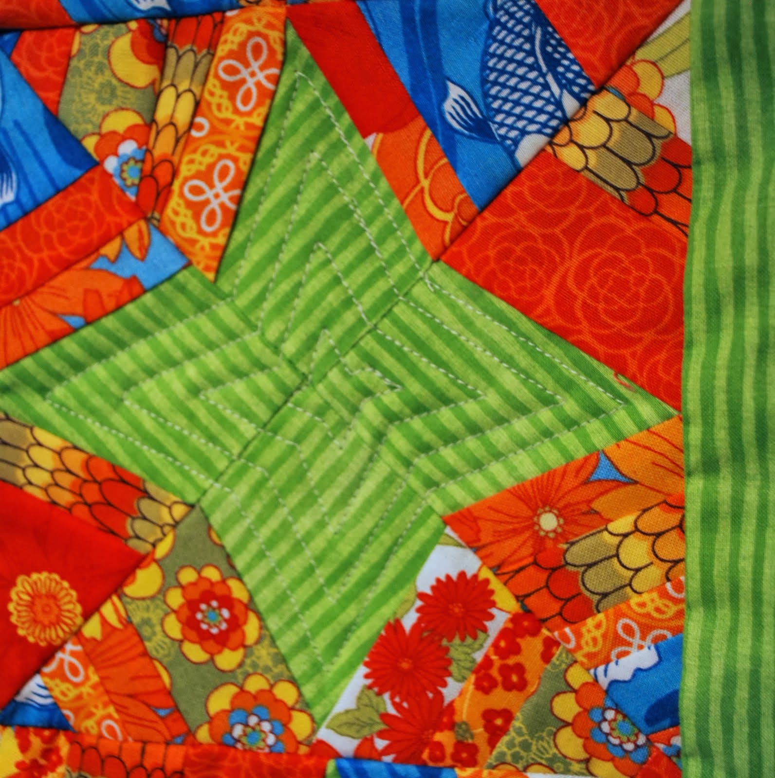 Even though I don't love some of my green centers, I went with outlining them instead of trying to walk my way around the 'webs' of color. Although it was a little time consuming, it's just about the only quilting on the piece, so it isn't overwhelming and didn't eat up all my time.