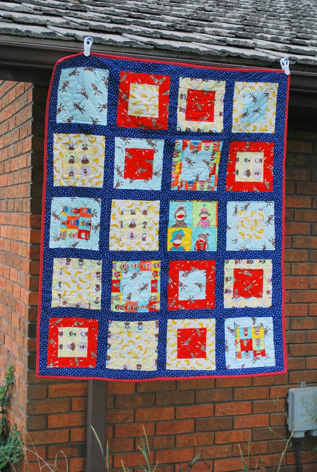 Although I didn't use up all of my stash of this sock monkey fabric, I made another large dent in it - and I did come very close to using up the two mugshot style prints (a completely un-child-friendly name for them, I know, but I don't know how else to describe them) as well as the yellow/pastel bubble fabric that makes up the entire back.