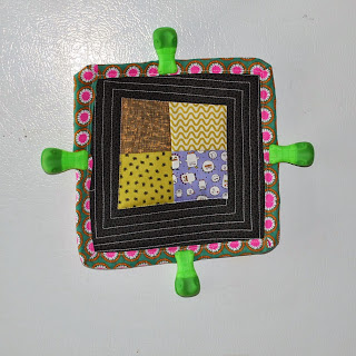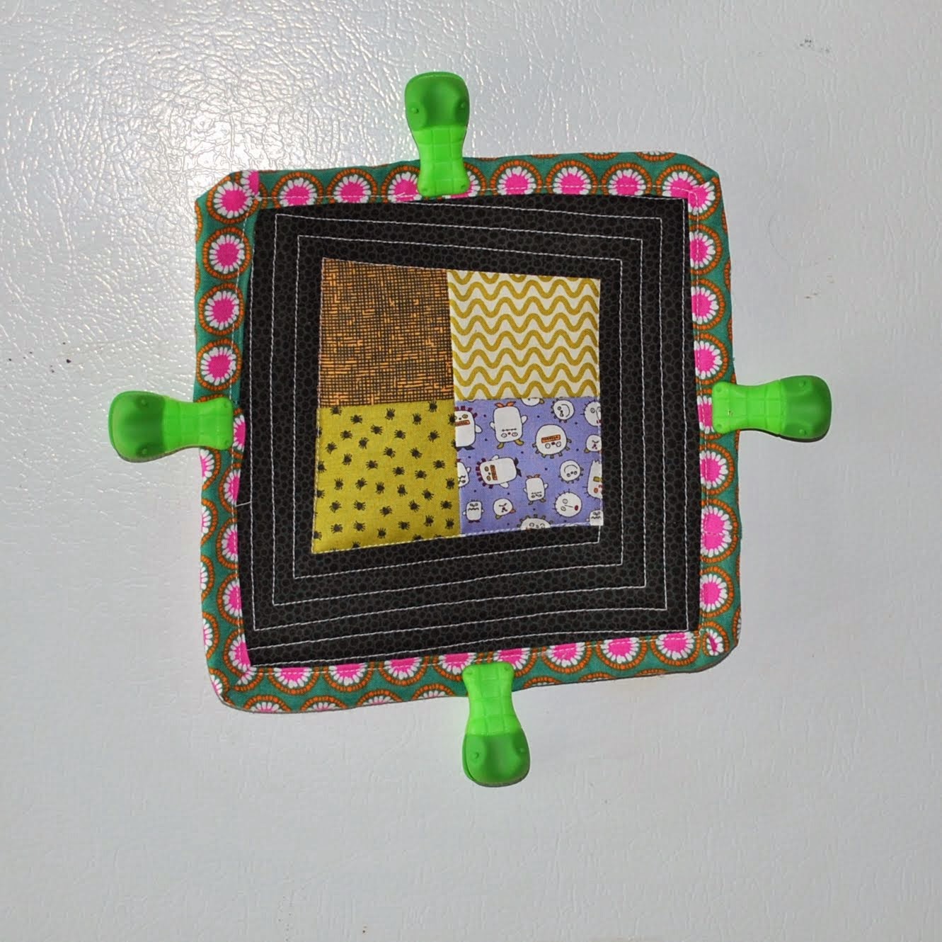 A quick very little mini I threw together from the few leftover blocks after finishing the holiday runner. I still have four more blocks to find something else to do with, but I wanted a quick item to hang on the fridge (where I almost always have something decorative hanging) and this was easy enough. Especially since I was able to use binding I had already made (and removed when that project needed reworked and then never used when I fixed that project). It's nothing much, but it matches the runner - which spends weekends over the back of the chair the cat likes to scratch - so there's some coordination throughout the house. (We're rarely in the living room unless we have people over, so that's the only time the cat attacks the chairs. That I know of.)