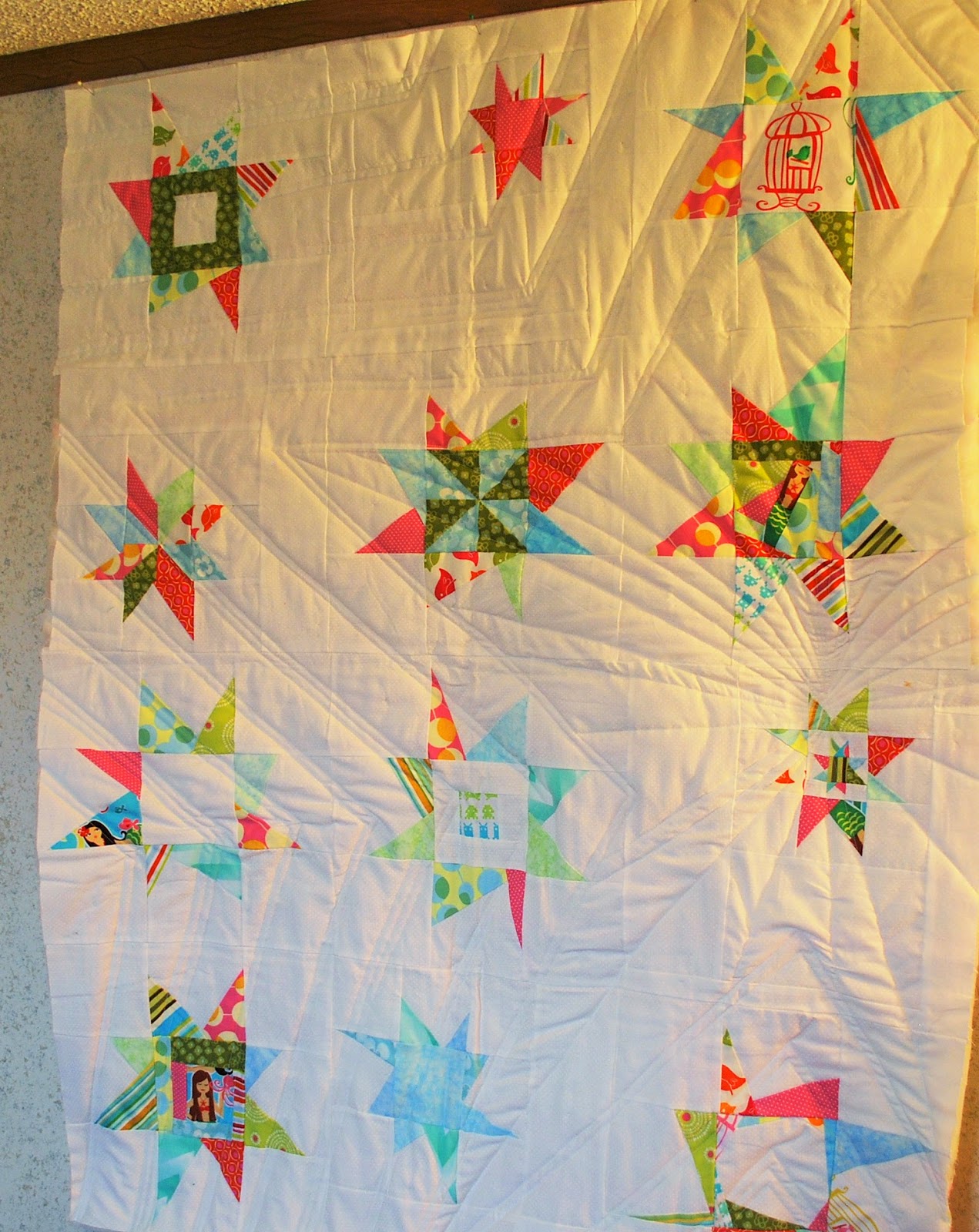 I chose a point to act as the 'center' of my star and added lines from the outline of the star toward the center. Some points have a lot of lines, others only three or four. I didn't want to be too structured in what I was doing -- and I didn't want to overwhelm the center area with too much quilting. It's already a little thicker than I'd intended in the center area, but I think it'll loosen up a little with a wash or two.