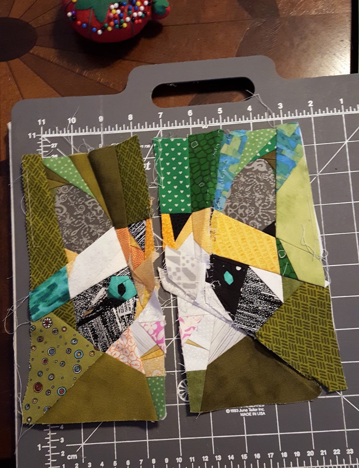I've only got a little more ripping to do, part of the seam between the orange patch and the eye, then disconnecting the eye from the remainder of the black (streaky) patch. I'll then re-do both the eye (one section) and the tiny black and white section nearest to it -- not because there's an issue with the second section, but because I don't think I can remove it in a salvageable piece. Also, I'd rather remake than continue to seam rip... Honestly, I very nearly just remade the entire first half rather than pick it all apart. But, I'm hopeful I can get this apart, fixed, and back together.