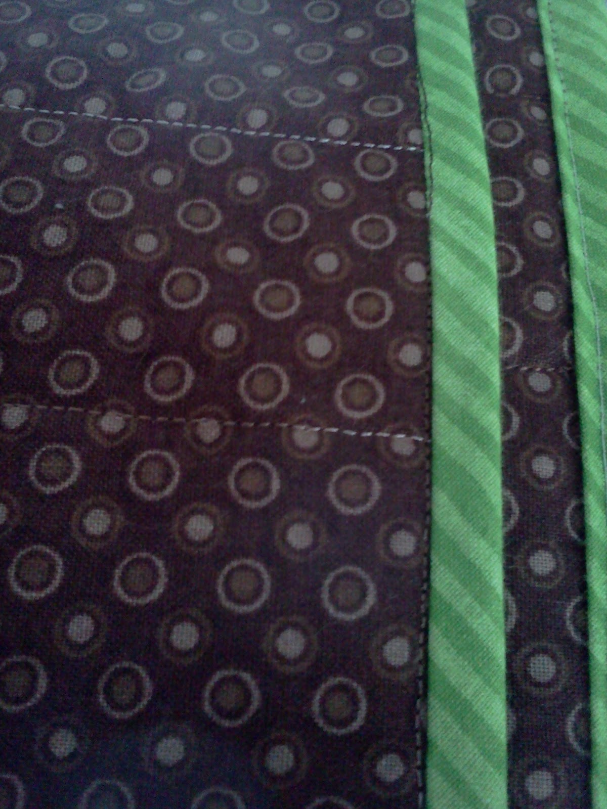 Turning the binding around the side of the quilt and attaching it on the reverse side was a little more difficult. I wish I'd gone a little larger than 2 inches for the bias tape width - I could have used a little bit more on the corners. Eventually I got it pinned and sewed down. I had hoped to be sewing on the quilt top on one side of the quilt and on the binding on the other, so I used variant color brown thread (my quilting thread) on one side and variant color green thread on the other.