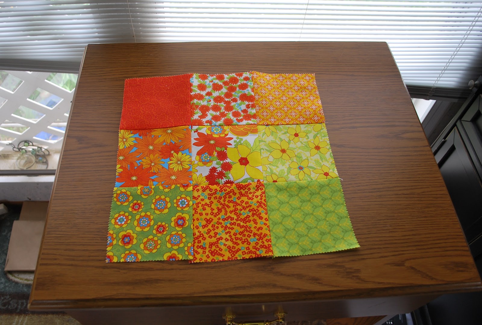 After making the nine patch, I followed the general instructions in my hand-me-down quilting book and cut the nine patch square in half horizontally and vertically, resulting in four new squares from each nine patch.