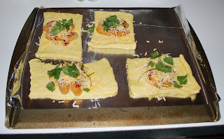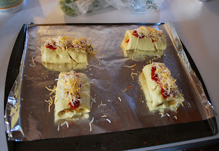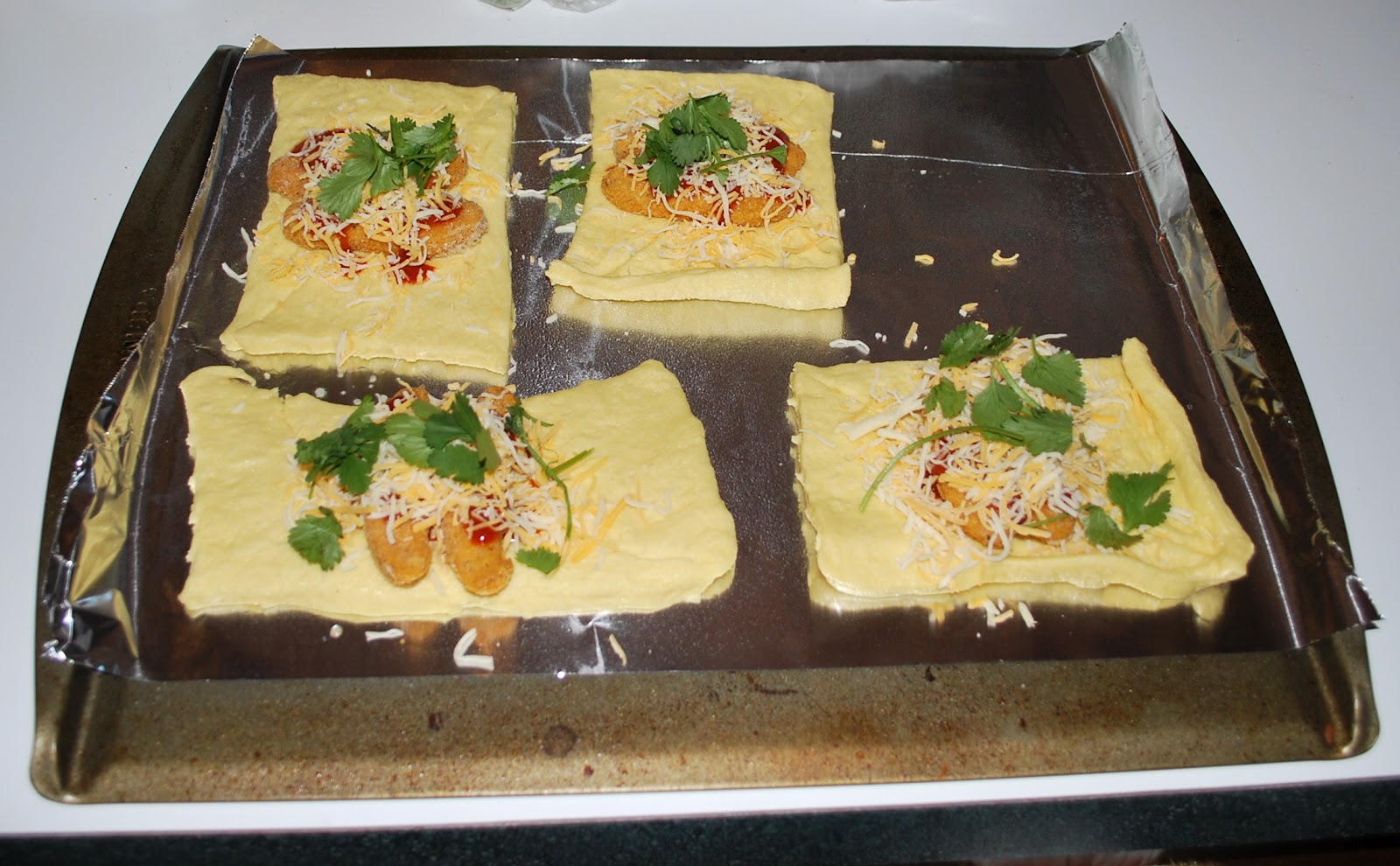 Like I said, I'd want to add more sauce on the inside, and change when I added the sauce to the outside, but these weren't bad. Next time, I'd like to try them with 'real' chicken instead of fingers, and perhaps add onion as well, but it was a fun attempt.