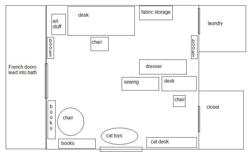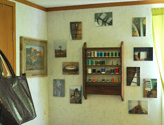 Obviously, it isn't the best layout for use - although the cat has a pretty good layout. I've spent more than a year trying to rearrange the room to serve all these needs better, but so far, no luck. So there's no wall space directly near the sewing machine. The nearest space is the wall over the top of the cat's desk: