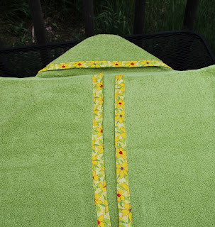 I followed the same directions from Obsessively Stitching, but this time I took the time to trim off the towel's finished edge. A fat quarter left over from my April Showers/May Flowers quilt - which matched nearly perfectly - turned into a little bit of trim for the hood and edges.