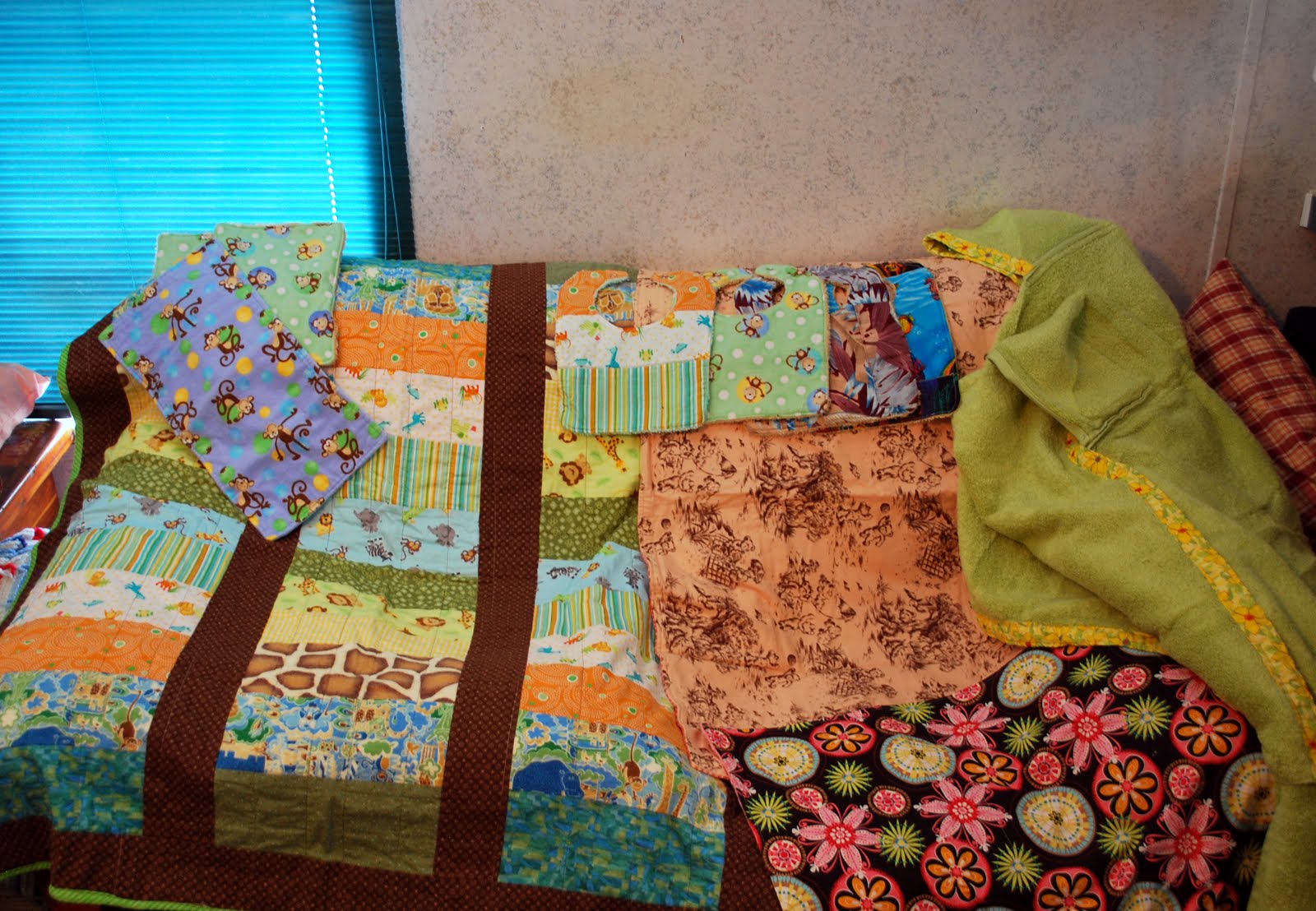 Two hooded towels, two flannel/terry wipes, one flannel wipe, a towel/apron for Mom and Dad (not pictured), a small minky blanket, a flannel/bear blanket, a quilt, and four terry cloth backed bibs.