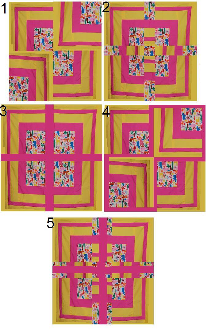 - Cut into four equal parts, add a pink frame, reattach, then do the more/less disappearing 4 patch process