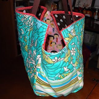 I think this is going to make taking the machine along on trips a little easier. Sure, I'll need something a little sturdier if I should ever happen to fly with the machine (not a plan) or take a ride in a carpool (more likely, but still not exactly a plan). So it's not a forever fix, but I think it'll do nicely for now. And even if it doesn't, I still had a blast with it - and I can at least carry my other tools and the baby quilt I'm working on at the moment in it - which makes it a win win win in my book!