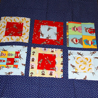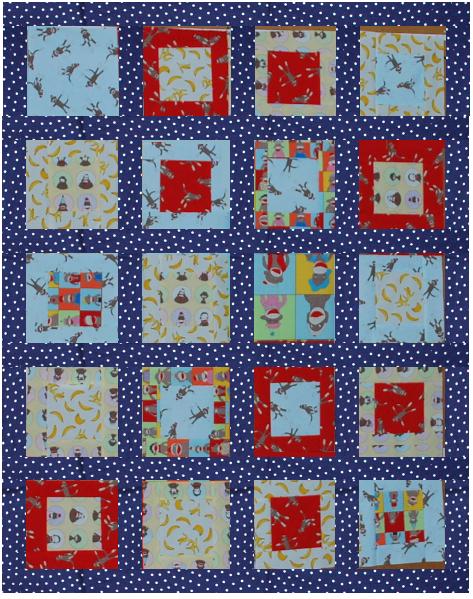 Monkey fabric from my stash (from at least two designers, I think, but it kind of works together) in a quick stack and whack kind of pattern.