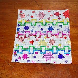 A long time ago - okay, June/July of 2012 - I started planning a quilt I was going to call Rainbow Road or Wonky Stars. The sketch started out something like this: