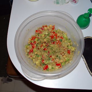 I didn't quite have the ingredients to follow the recipe (what's new) but I used it as inspiration and started down as close a path as I could take. I wound up with lime juice instead of lemon, and sadly, I only had dried basil (fresh would have made a big difference). Instead of corn, I went with avocado, and eventually I threw in a few leftover black beans too. So, I didn't wind up with the same recipe at all - but at least I was inspired to do something with quinoa aside from using it as a rice substitute!