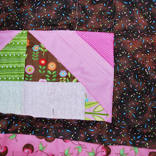 My machine and I have yet to come to an agreement on how to work without the feed dogs up, which puts things like the 'typical' meandering free motion quilting out of my reach right now. Which was a little disappointing (again) when it came to trying to figure out how to quilt my Chocolate Covered Cherries quilt. I really thought something like the meandering free motion style would have worked well to help blend my franken-blocks, as well as not clashing with the on-point blocks (like I think straight line quilting in any direction would have).