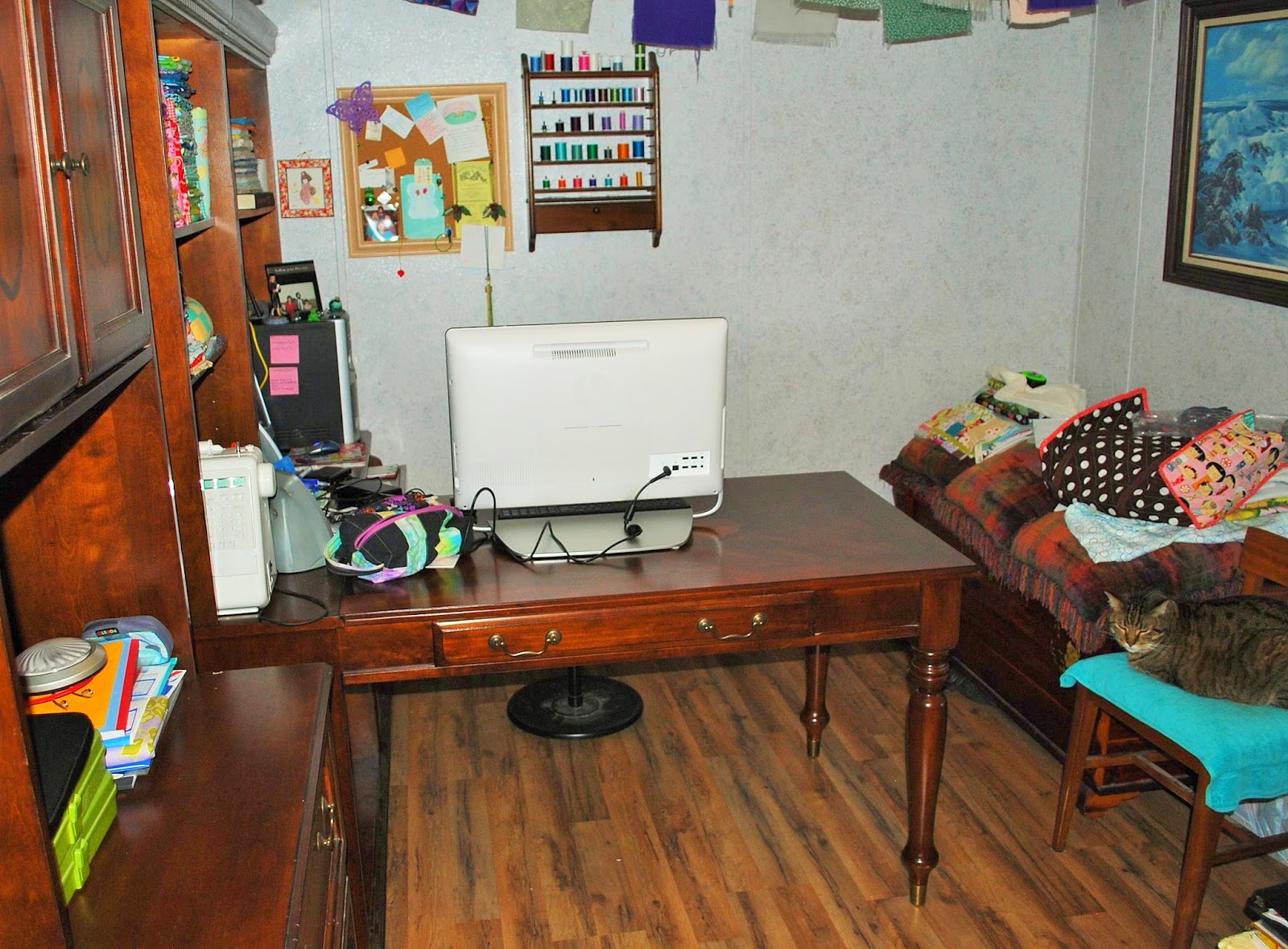 The old computer desk, old sewing desk, and my lovely green china hutch have all left the room for good. If I had a larger space, I'd have worked to find a new home for the hutch, but there just wasn't a space and it wasn't worth trying to store. At the moment, this room is down to my new 7 piece desk/storage unit, the cedar chest, and the black baker's rack (visible in the 'before' picture). My goal is to eventually clear off and replace the baker's rack (which is about .25 inch too deep and keeps the closet door from opening as wide as I'd like), but it'll take a while to figure out how to make those changes. The cedar chest is probably staying put for the foreseeable future, and it looks like my old office chair will be staying as a window seat for Momo - at least for now. I still love that chair, but it needs some wood glue or something before it can be a human chair (our new flooring is slick enough it just slides apart under much weight/movement).