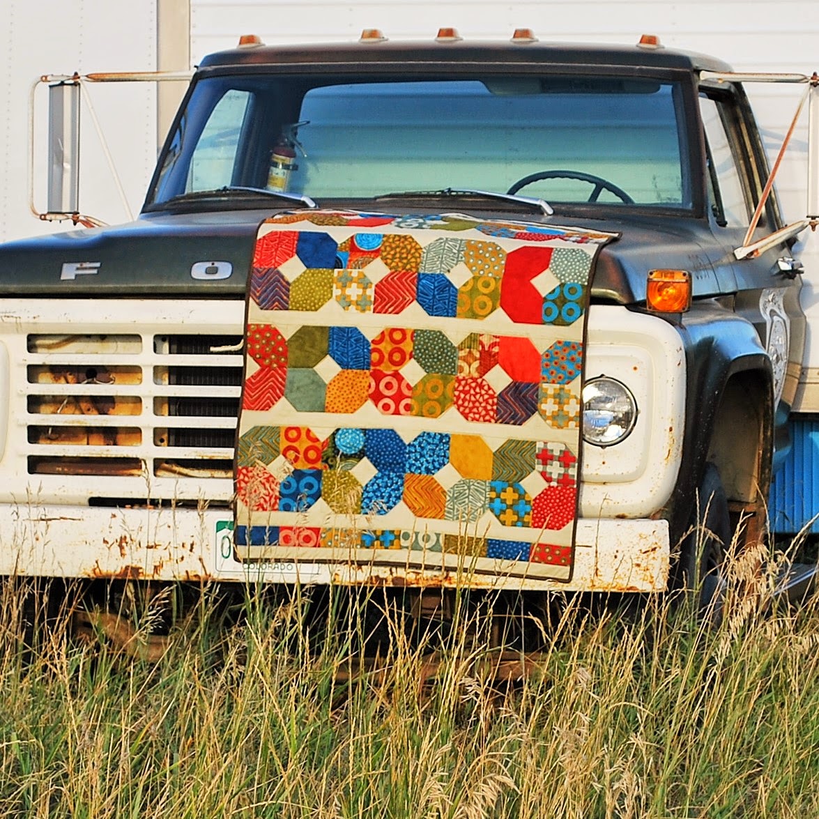 Difficult lighting aside, it was surprising how many things around the farm I could find that kind of color matched with the quilt. This rusty old olive green pick up was a surprising match, though here it doesn't quite look it.