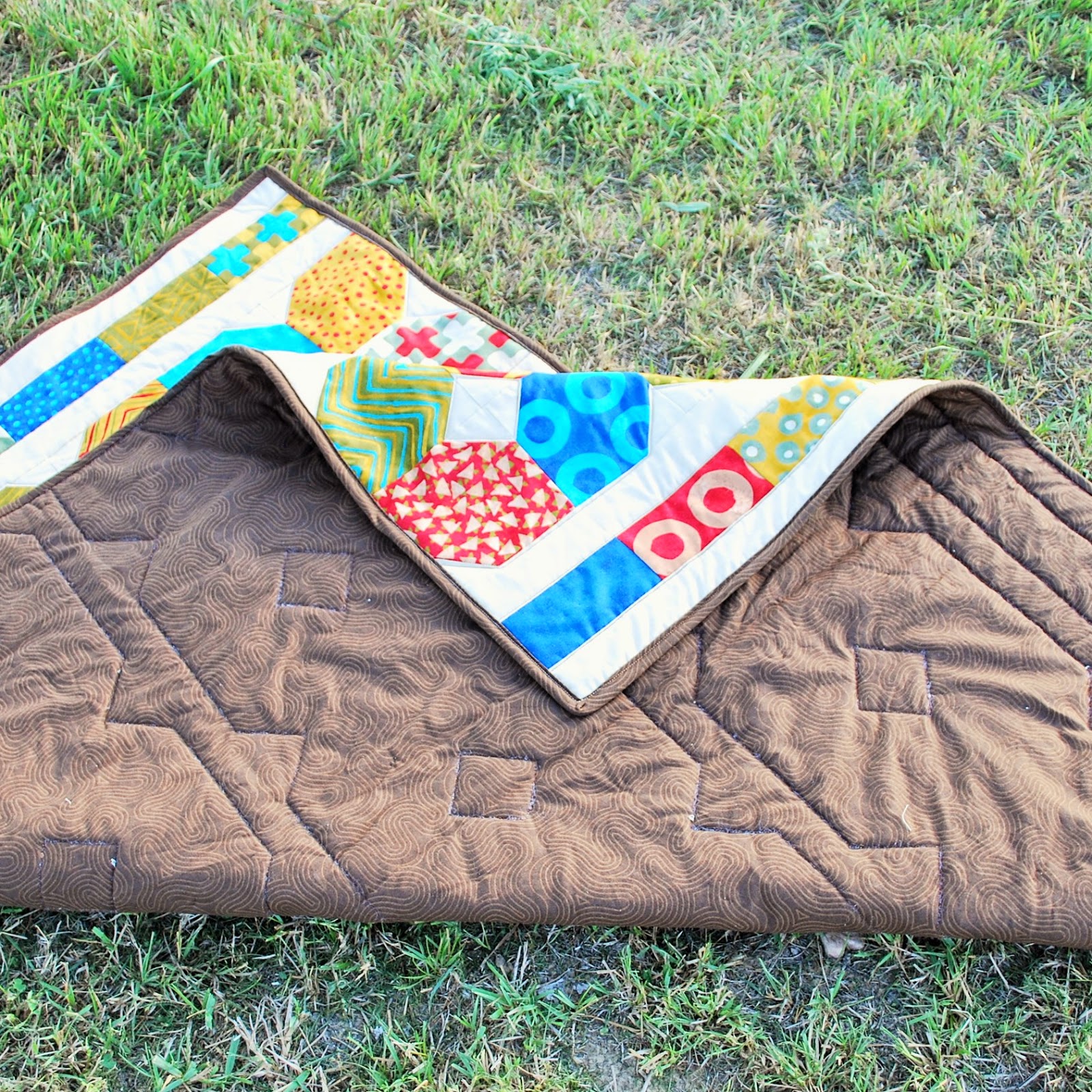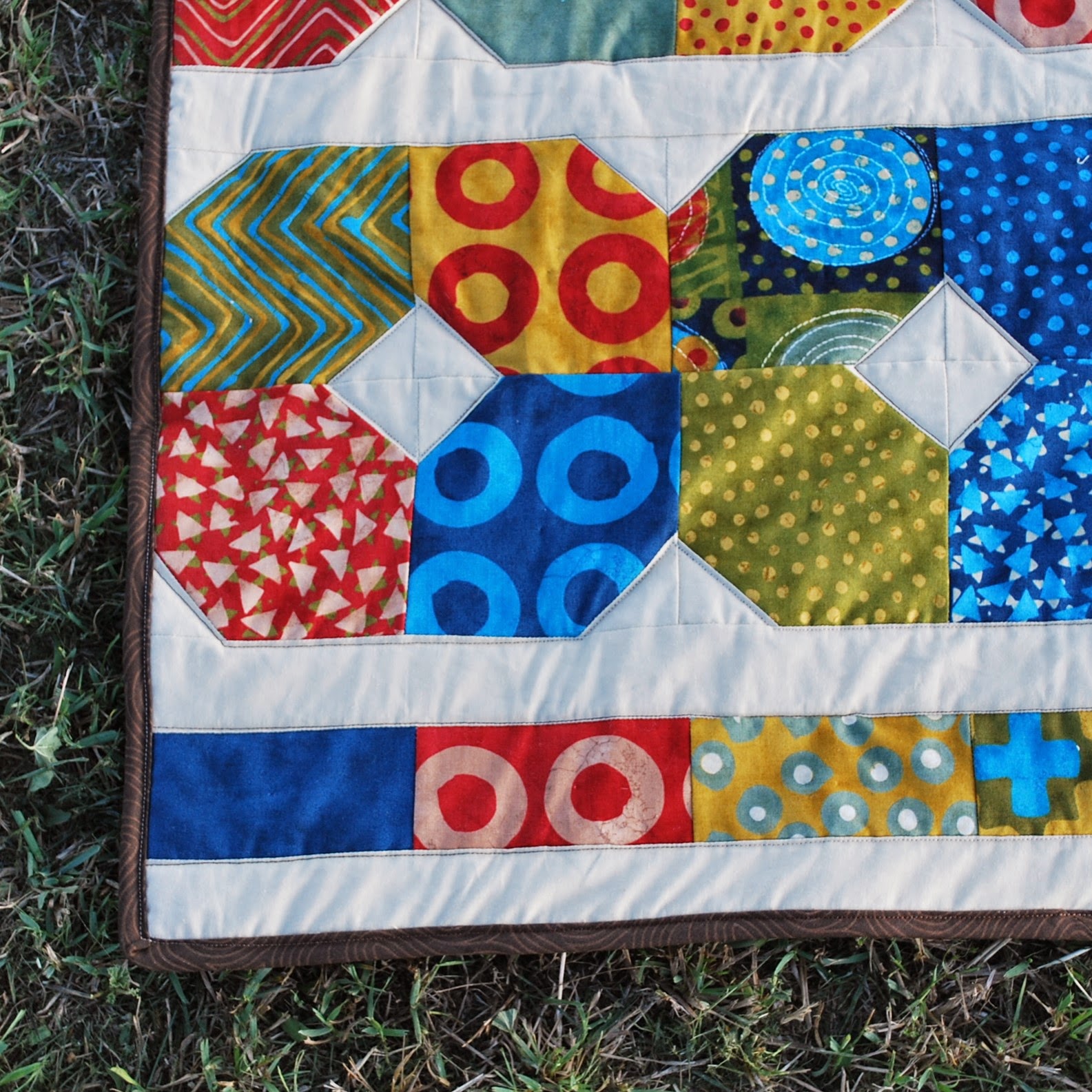I used the same fabric for the binding and backing, which gives the back a very continuous look. I also like bringing the backing fabric around to the front -- since the backing fabric is in no way represented in the top. It could have felt a little dull compared to the bold prints of the charm squares, but I think it actually works nicely.