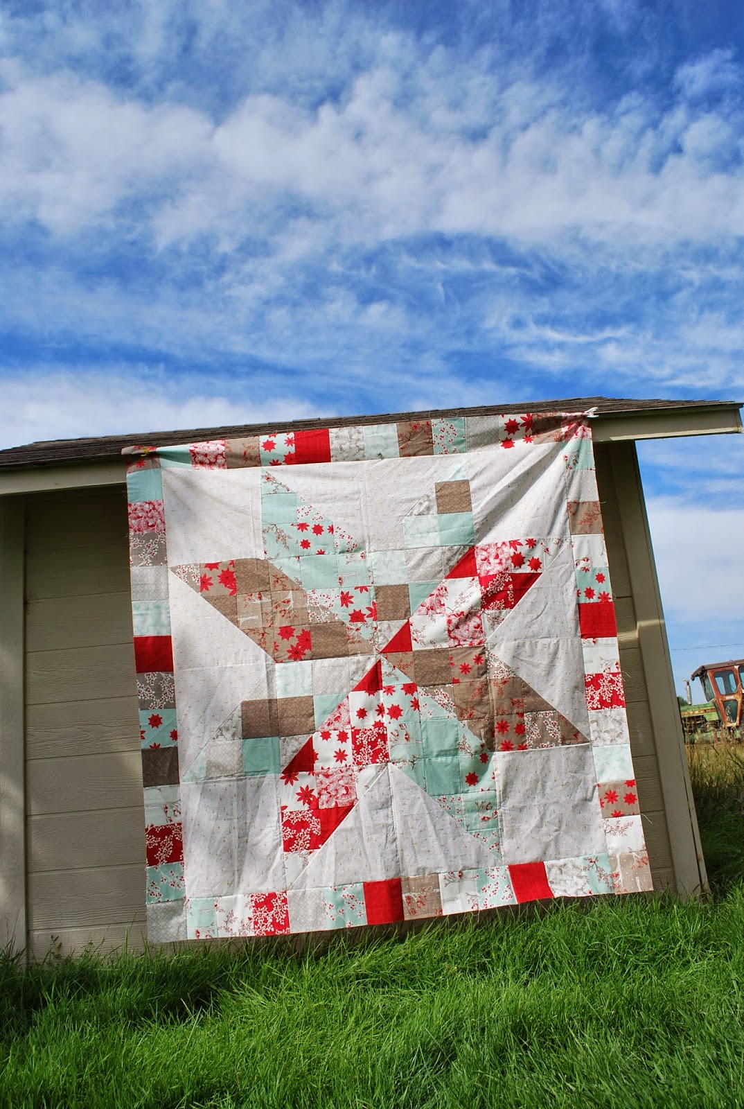 I swapped the two sections in the bottom left! It should always be 3 points before the same color again, but there are only two points between the reds (or four, if you're going the long way). It does unbalance the quilt a little bit to have a red heavy side, especially since the red is so much stronger than the mixed piece it was swapped with -- but I am not going to fix it now. If I'd noticed before the border went on, I might have been able to talk myself into it, but at this point, I think it's that way to stay.