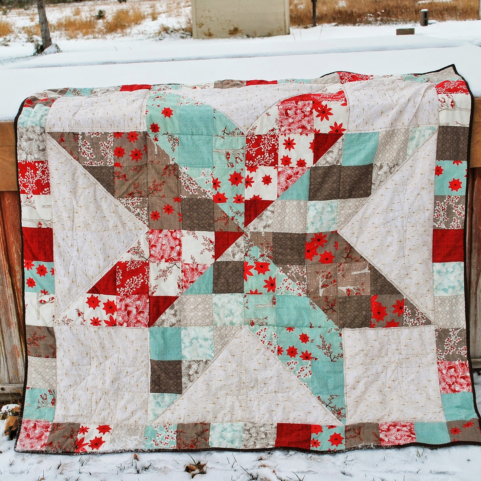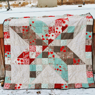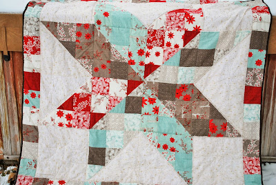 What a difference a few hours makes! When I took the pre-wash photos, the outside world could have passed for summer still. Not any more. I only managed a couple of photos before my fingers were too numb to continue, but here's the Christmas Star quilt finished at last!