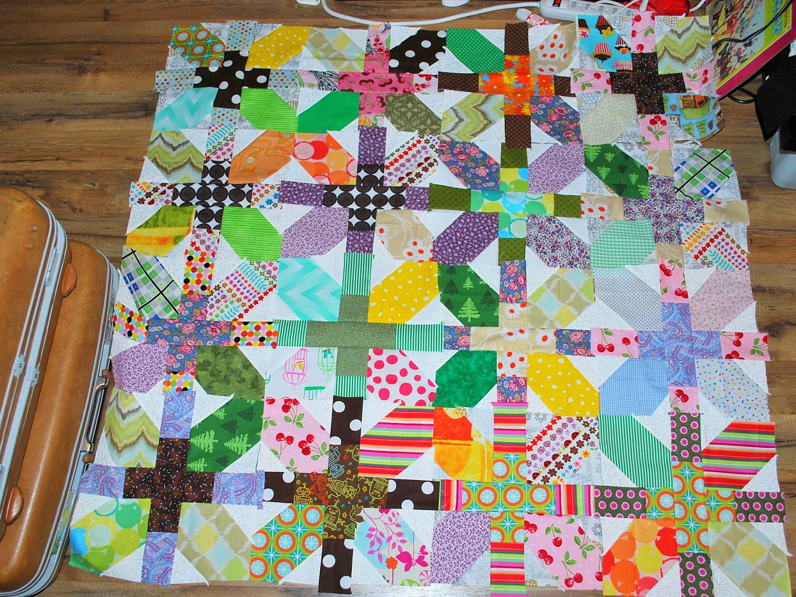 I didn't put any energy into choosing a layout, I just put them down and snapped a photo. That's kind of an encouraging thought, because I don't see too much that would have to be rearranged if I wanted to start sewing the top together right now. Oh, I'm sure I'll play around with it a little more before I decide on anything, but it is nice to see that there's enough going on that random placement doesn't look too bad. I do see a couple blocks that might require re-sewing -- I'm really hoping the top right block looks off because it's not square on the ground, not because I managed to sew it that wonky!