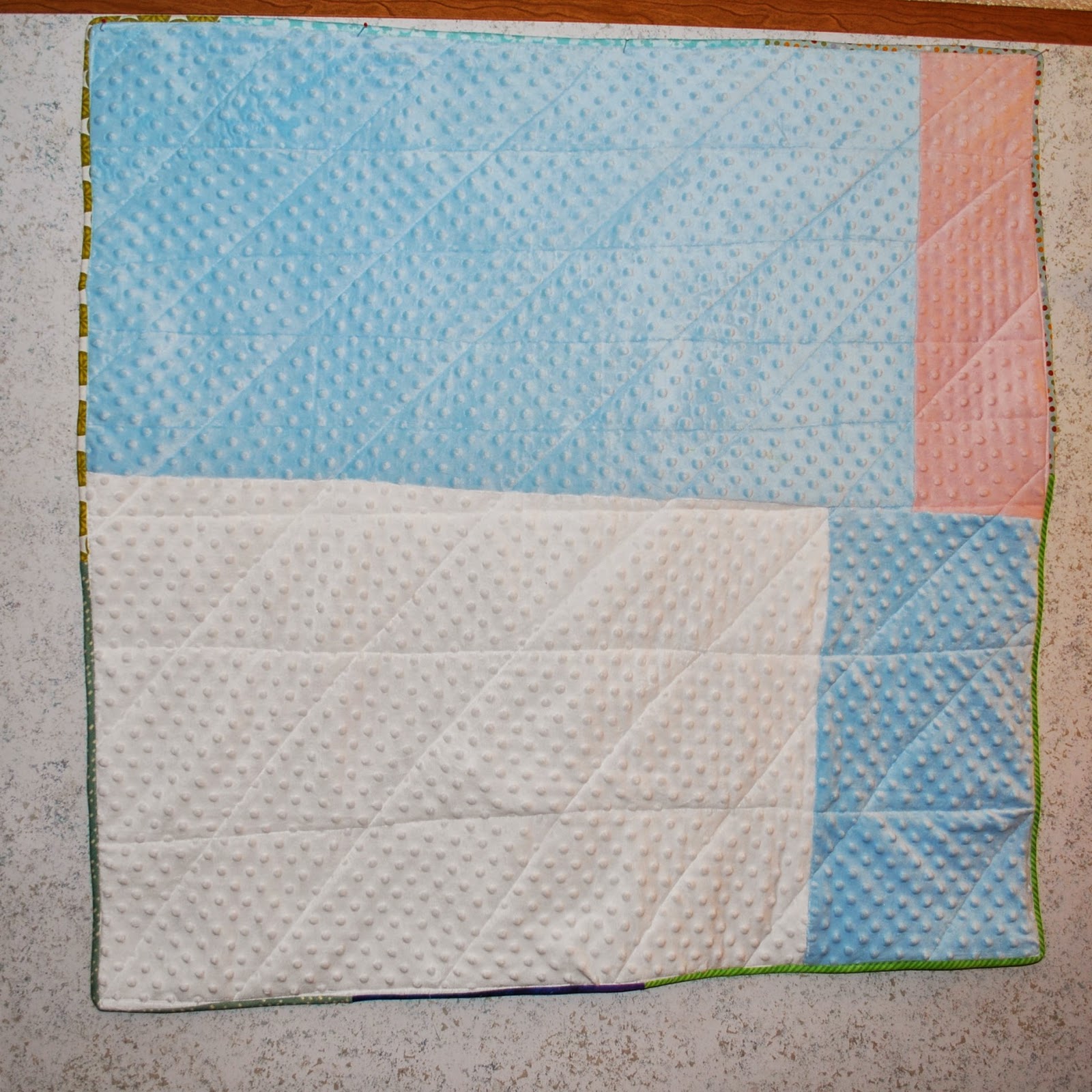 Mission accomplished -- and not a pucker in sight on the back side! Quilting with minky, without a walking foot, can be a challenge (I'm told a walking foot helps, and someday I'm going to find out!) to keep everything feeding together, but I was able to work fairly slowly and carefully to try to hold my sandwich together (along with using a lot of pins).