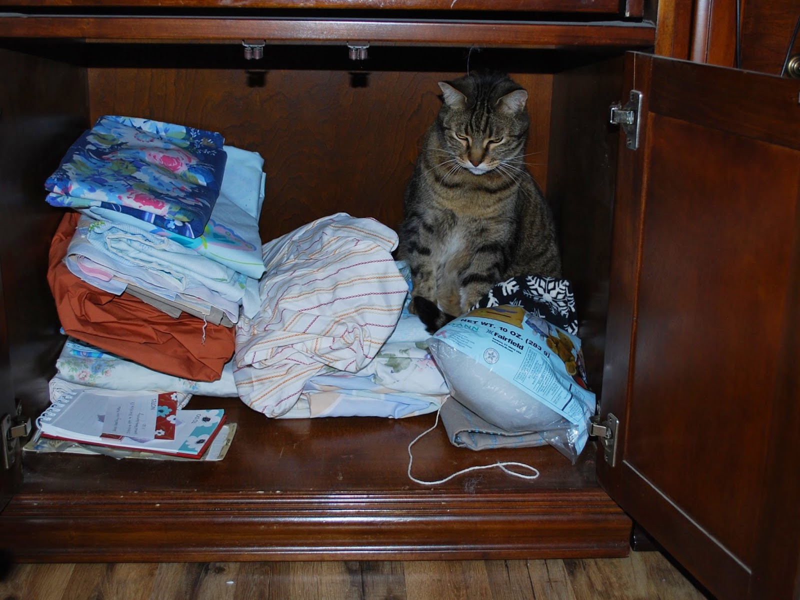 With a little help from someone who is absolutely not allowed in that cabinet -- which explains why he started awake from a snoring deep sleep and leaped directly into it (over my body in the way) to investigate and eventually nap on all the fabrics... -- I pulled out a couple options from my vintage sheet stash. Narrowing it to one was a challenge. All along I had been thinking about using one of my favorites, a yellow roses print, but I pulled out the next one in my stack as well and was surprised how well this other option fit with the quilt top.