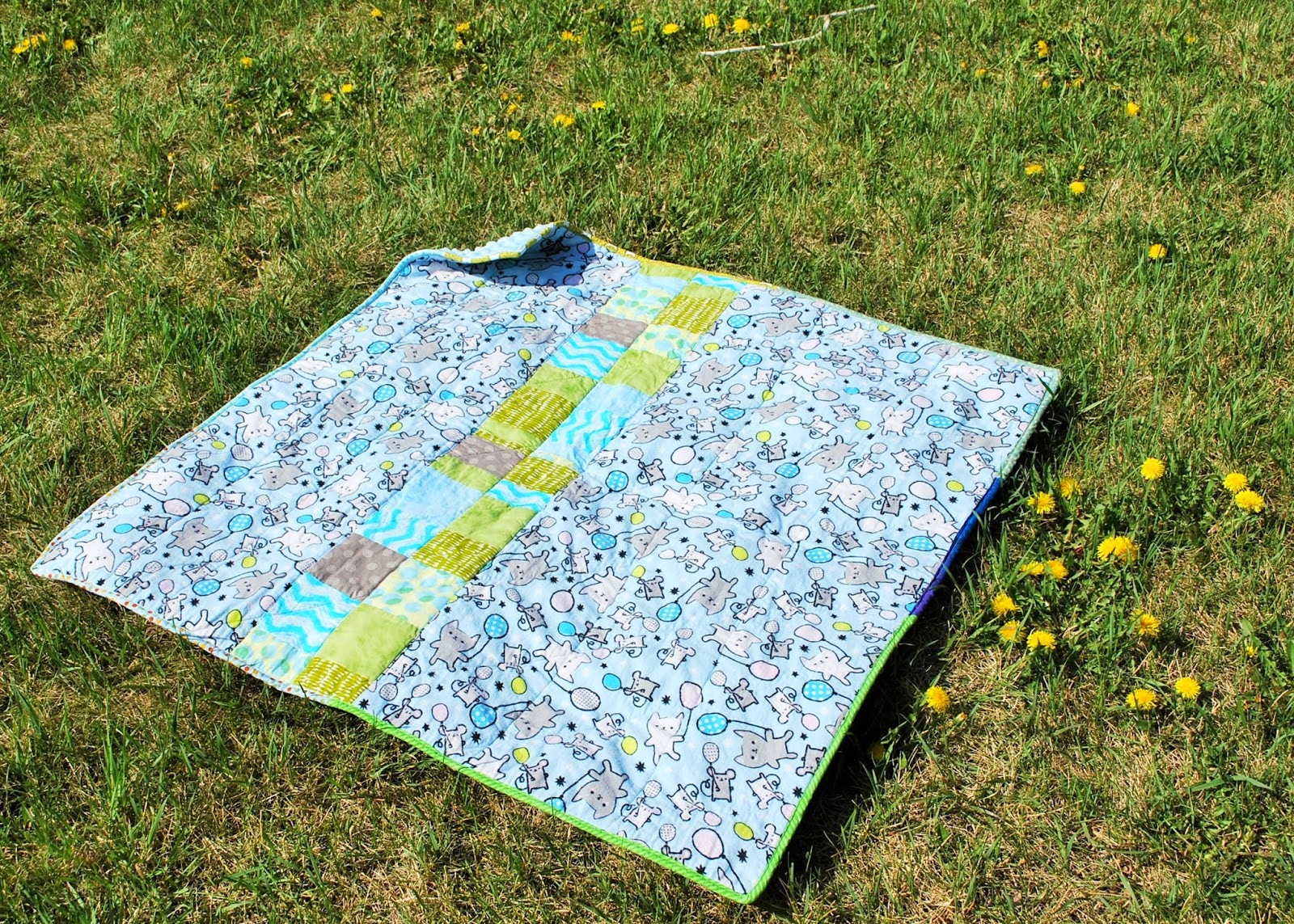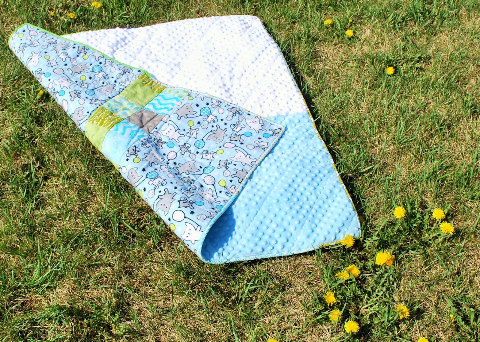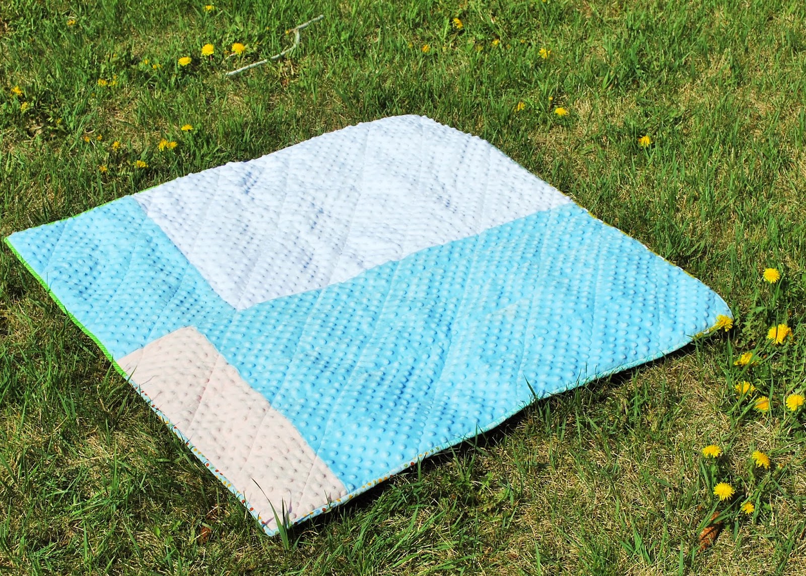 Although it is backed in minky fabrics, I did use batting to make it extra thick. This makes it a little harder to snuggle with, but it should work better for a floor mat or play space -- which is one of my worries right now.