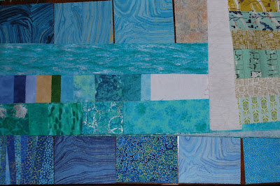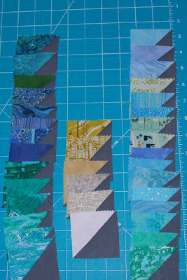 I also picked up an odd sized jelly roll from the precut area at my local Joann Fabrics, going for similar blue/green/shiny shades. I'd hoped to include a few leftover regular jelly roll pieces (as noted by the white stripe going the 'wrong' direction) but discovered after taking the picture that the Joann roll pieces are slightly more than 2.5 inches, which was a better size for my half square triangles, but meant that my other jelly roll pieces were a no go.
