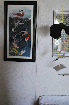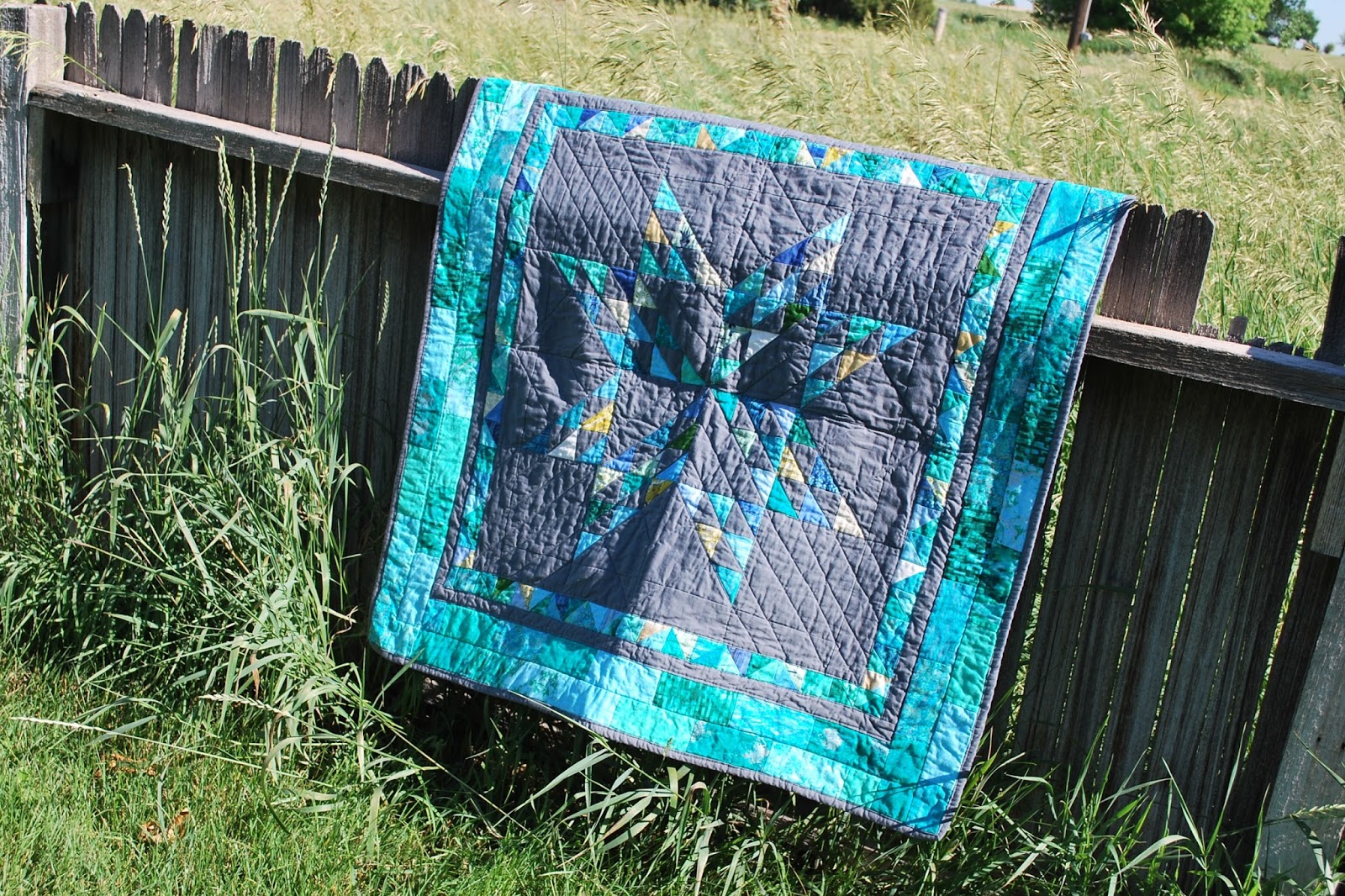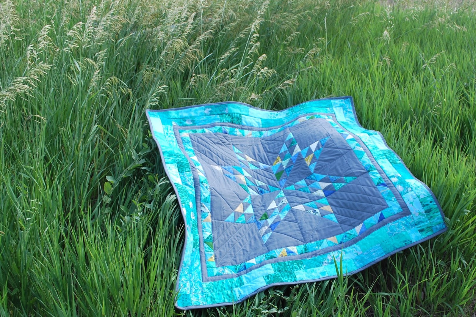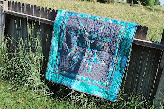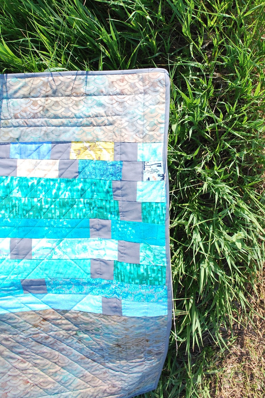 I had to take the quilt all over the place to get some pictures of it. I just like the contrast of something that to me seems so 'ocean-y' lined up with all this grass and farm equipment and such. I'm also a big fan of green/blue/grey color combination, so to me these are very soothing pictures.