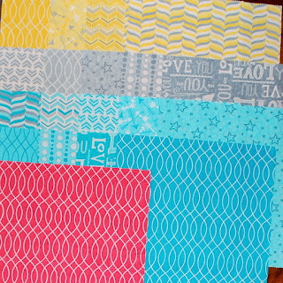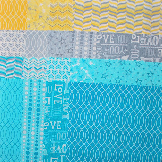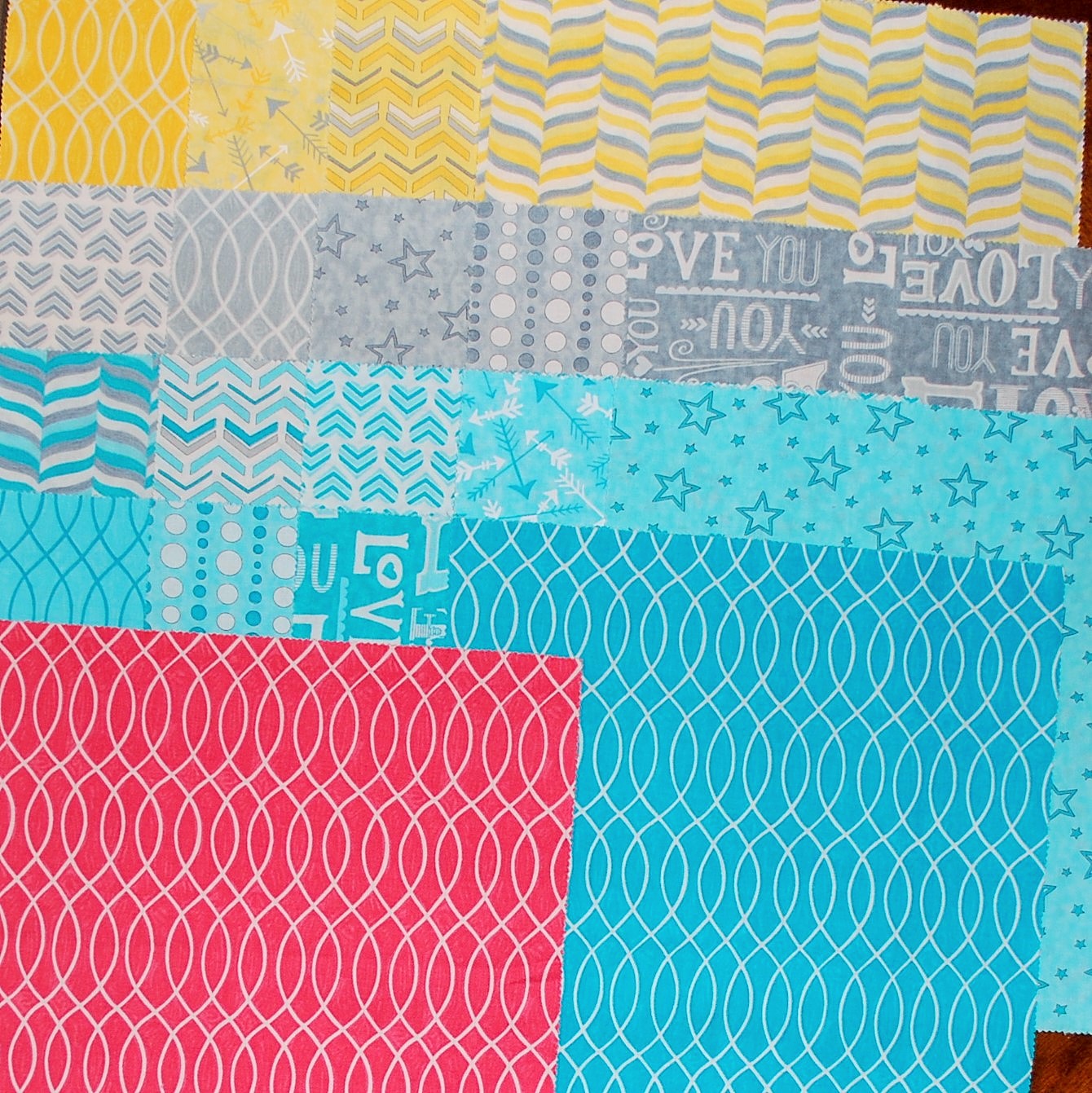 From a layer cake of Hugaboo fabric I picked up specifically for this hopeful-baby, I started pulling choices, beginning with the yellows, grays, and aquas.