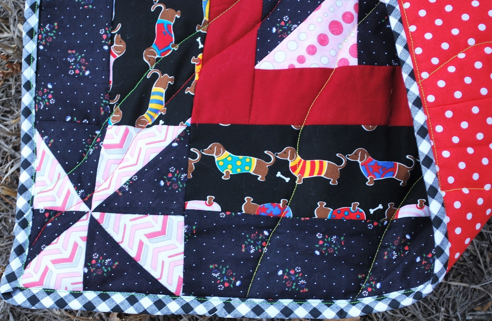 Some of the fabrics came from my stash, some came from the group stash. But I'm really thrilled with the way they all worked together. The black floral print and the light pinks really work together, and while the dog print and the candy hearts on the back seem a little bolder, they really work well with the colorful quilting.