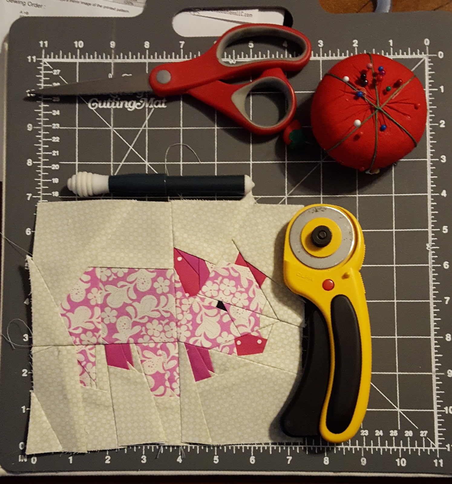 I'm the first to say, it's adorable. I love it, I really do. But I did not think I was going to make it through this pattern. If it had been a free pattern, I would have quit before I finished the second unit. But, I pushed through and I'm glad I did. The hardest part was deciding whether I wanted to use the floral pattern fabric for the body or the ears. She was initially going to be dots all over, but I learned with the fox that the dots are far enough apart they don't always show up, and I had two votes for the patterned body. They were right.