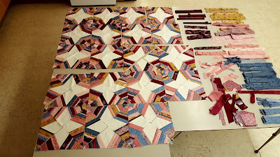 I can (and probably will) add some borders from the strips we over-cut. But I'm thinking another row and another column of triangle blocks would be nice. That's... a lot to take on by myself in the next couple weeks, but I think it's the right thing to do.